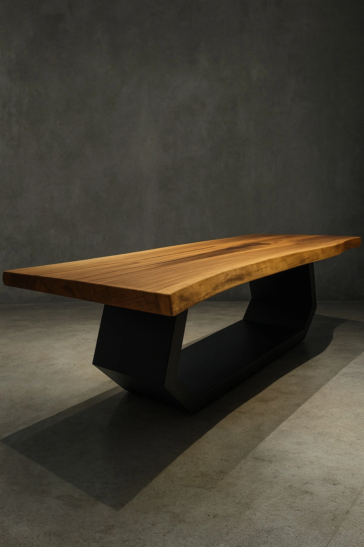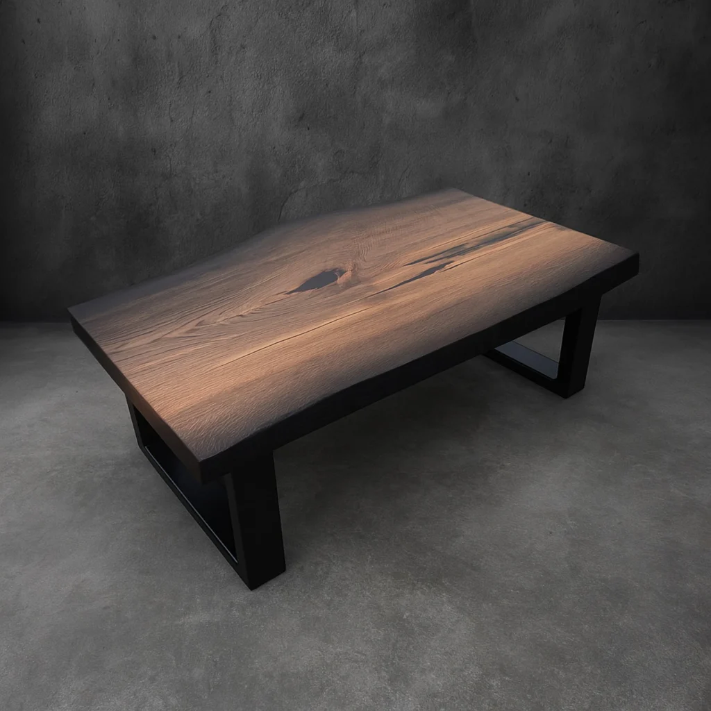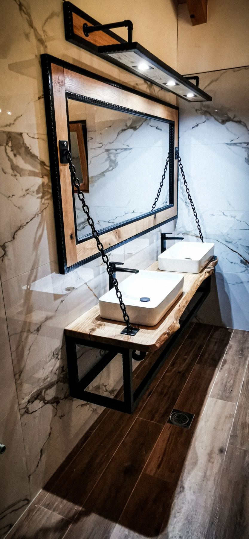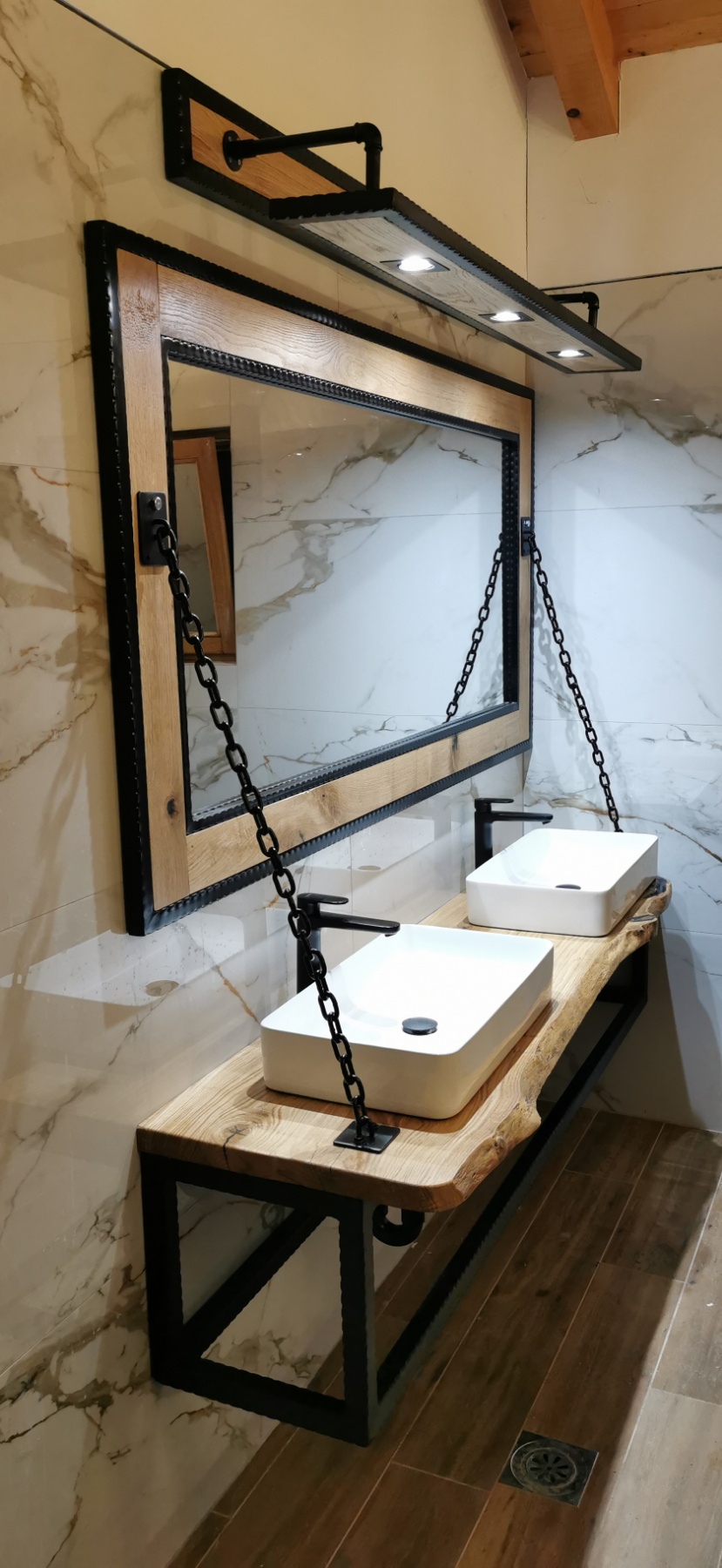 Ploča za umivaonik hrast sa prirodnom ivicom. Okvir za ogledalo od metala i drveta. Poliuretan lak.